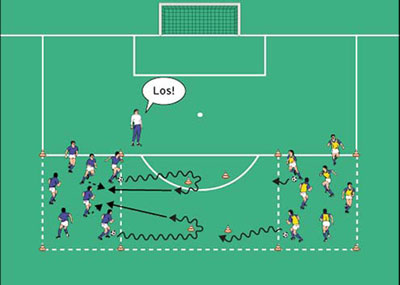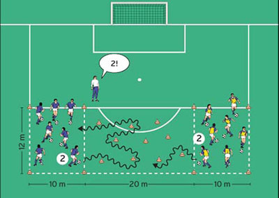 - با فرمان مربی هردو بازیکن مالک توپ هر گروه به طرف مخروطهای وسط رفته و دورآن می چرخند و از همانجا بلافاصله به یکی از همبازینشان در محوطه کناری پاس می دهند .