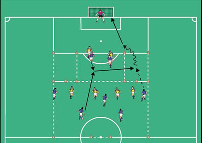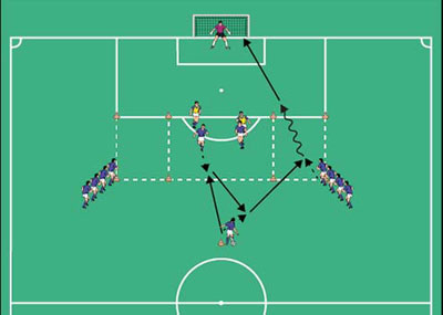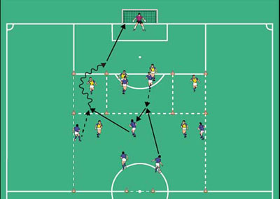 - پاس دهنده به اولین نفر یکی از گروه های کناری پاس داده و او دریافت نموده و پا به توپ وارد محوطه جریمه شده و از آنجا به دروازه شلیک می کند .