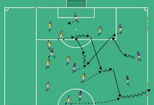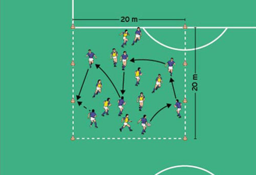 - با فرمان مربی بازیکنان یک تیم پا به توپ به دور مخروطها چرخیده و به درون محوطه تمرین بازمی گردند .