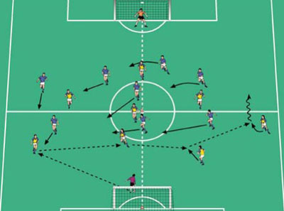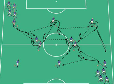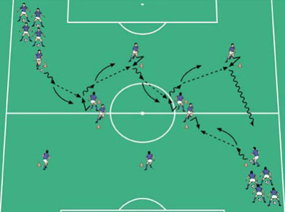 - تعویض بازی توسط بازکن تهاجمی وسط انجام شود . این بازیکن یک پاس به دفاع کناری دهد و او دوباره مستقیم بازی را بسمت دیگر عوض نماید .