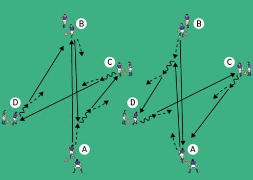 - D این پاس را کنترل کرده وبا بازیکن بعدی نزد مخروط B بازی کند ، این بازیکن آخر در مسیر عکس استارت بزند و ادامه تمرین ( شکل سمت راست را ببینید ) .