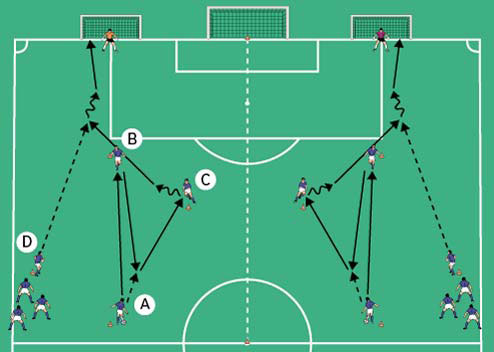 - ارسال پاس ها به این ترتیب باشد : A به B و B بهC و C به D که در حال دویدن است و D شوت بزند .