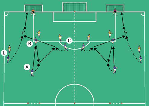 - A این پاس را کنترل کند و به C پاس دهد ، C با یک دریافت و حرکت کوتاه بازی را بسمت D ادامه دهد .